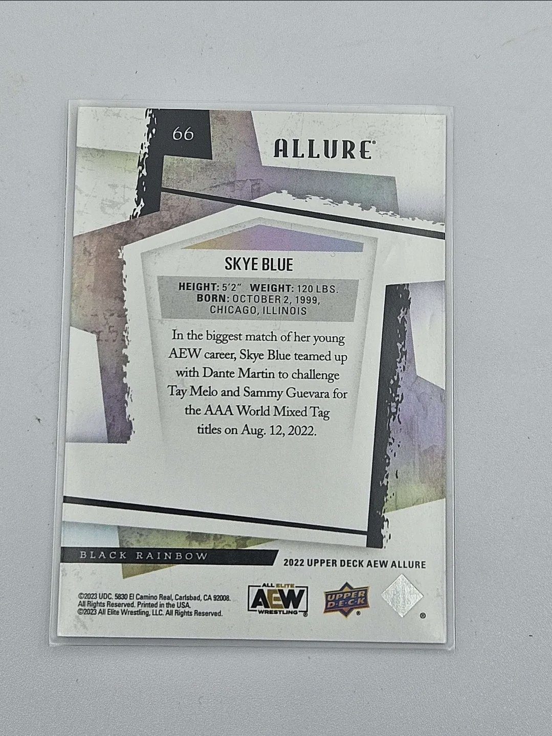 Skye Blue AEW 2022 Upperdeck Allure Black Rainbow Refractor Trading Card #66 features a stunning black rainbow design, making it a must-have for any wrestling card collector. Manufactured by Upper Deck, this sports trading card showcases Skye Blue, a standout athlete in the world of wrestling. The card is a part of the 2022 season and is a rare find for fans of All Elite Wrestling (AEW).